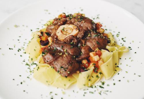 Ossobuco met lintpasta is een heerlijke en klassieke Italiaanse combinatie die perfect is voor een speciale gelegenheid of een etentje met vrienden. De malse kalfs (ossobuco) worden langzaam gegaard in een rijke tomatensaus met Barolo wijn, witte wijn, groenten en kruiden. De lintpasta, ook wel bekend als pappardelle, absorbeert de heerlijke saus perfect en creëert een smaakvolle en textuurrijke maaltijd.